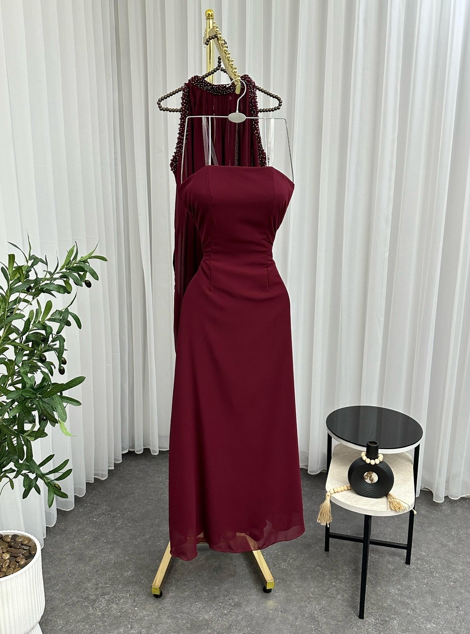 فستان عنّابي ملكي بكاب خرزي فخم وكتف مكشوف — إطلالتان ساحرتان في قطعة واحدة!