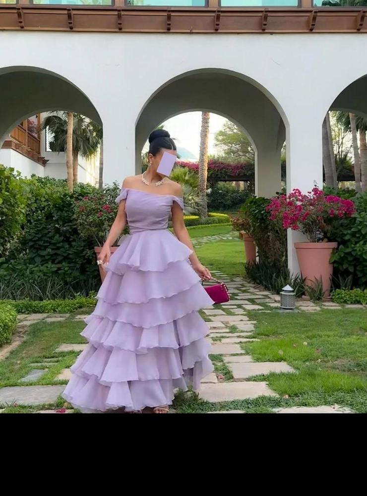 فستان أنثوي ساحر بطبقات ناعمة ولون لافندر رقيق، مثالي للسهرات والمناسبات الخاصة. تصميمه الرائع يبرز أنوثتك ويمنحك حضورًا لا يُنسى.