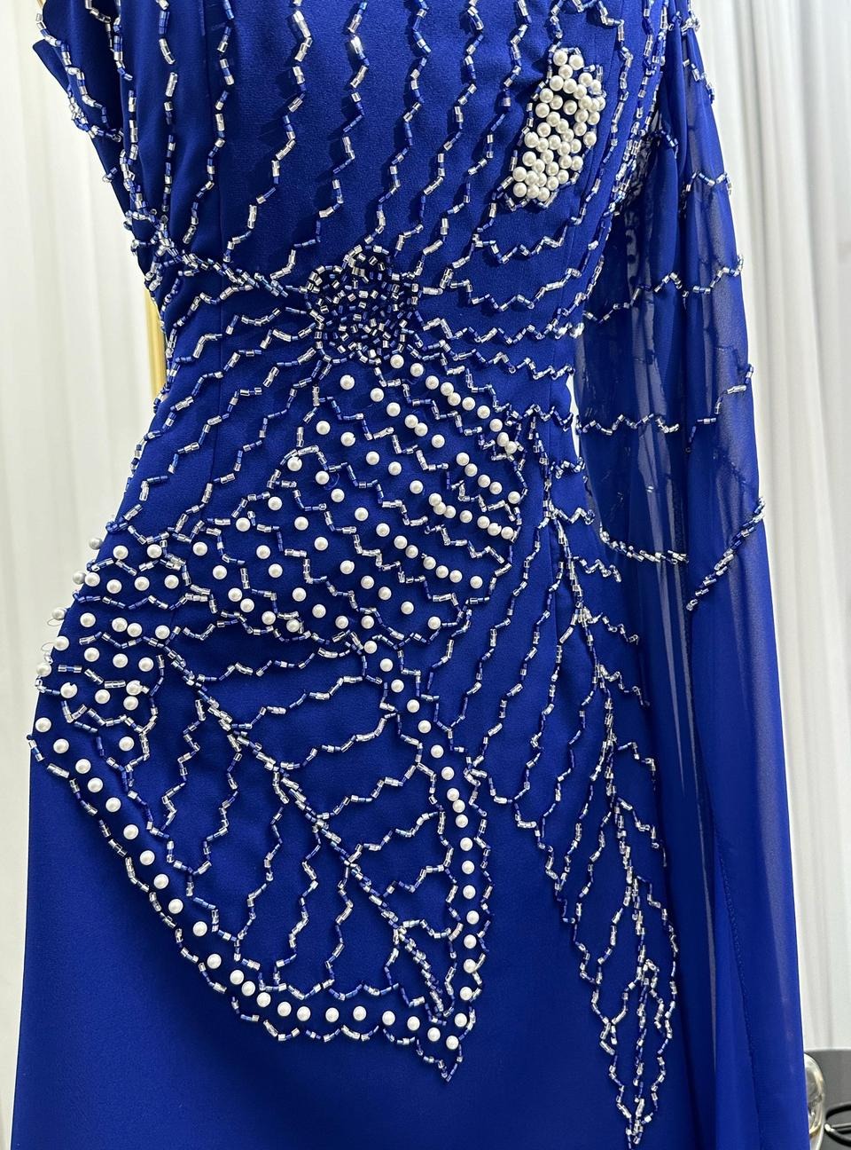 فستان سهرة بلون أزرق ياقوتي بكتفٍ واحد، مزيّن بخيوط لامعة ولآلئ بيضاء تتشكّل على الخصر بأسلوب أوراق أنيقة. قصّة ضيقة تُبرز القوام، فيما ينساب القماش بانسيابية جذابة مع كمٍ طويل شفاف يمنحك حضورًا فاخراً في أرقى المناسبات.